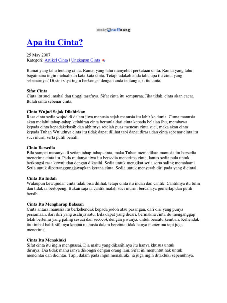 Kita gambarkan saja cinta itu seperti 3 orang buta dalam mendeskripsikan sapi. Keintiman meliputi perasaan keterikatan, kedekatan, keterhubungan, dan ikatan. Apa itu sebenarnya rasa cinta? Aku sudah menjalani percintaan itu selama 1 tahun 2 bulan. Justru ketika kita merasa tahu apa cinta itu, di saat itulah kita sebenarnya tidak mengerti. Lalu sebenarnya apa sih makna dari cinta itu? Jadi cinta sejati sebenarnya adalah cinta yang tidak melanggar aturan yang telah ditentukan tuhan. Dan kita dapat bertemu orang yang kita cintai di dua alam, yaitu dunia dan akhirat. Menurut teori cinta segitiga yang dikembangkan oleh psikolog robert sternberg, tiga komponen cinta adalah keintiman, hasrat, dan komitmen. Semua orang ingin tahu apa itu cinta sejati dan banyak orang berpikir mereka bisa merasakannya saat hal itu lagipula, apakah benar cinta sesuatu yang sebenarnya mungkin atau apakah itu semua ada di untuk memahami cinta sejati, kita perlu memahami cinta. Rasa cinta itu muncul karena anda menginvestasikan begitu banyak uang, waktu, dan tenaga untuk merawatnya. Cinta bagaikan secangkir kopi tanpa apalah jadinya jika hidup tanpa diiringi dengan cinta? Setiap orang pasti pernah merasakan yg namanya jatuh cinta….